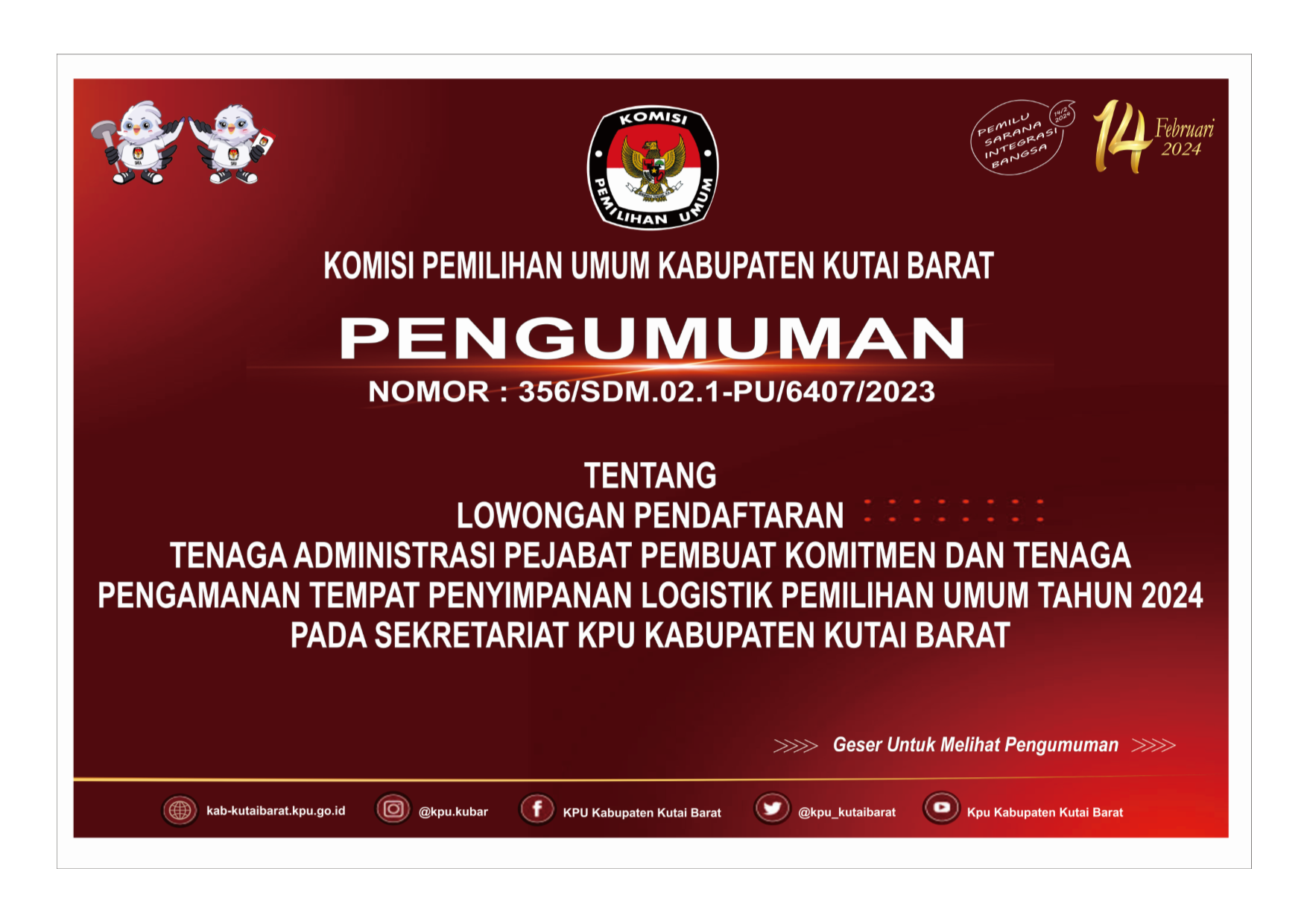 Berikut Pengumuman KPU Kabupaten Kutai Barat Nomor: 356/SDM.02.1-PU/6407/2023 Tentang Lowongan Pendaftaran Tenaga Administrasi Pejabat Pembuat Komitmen dan