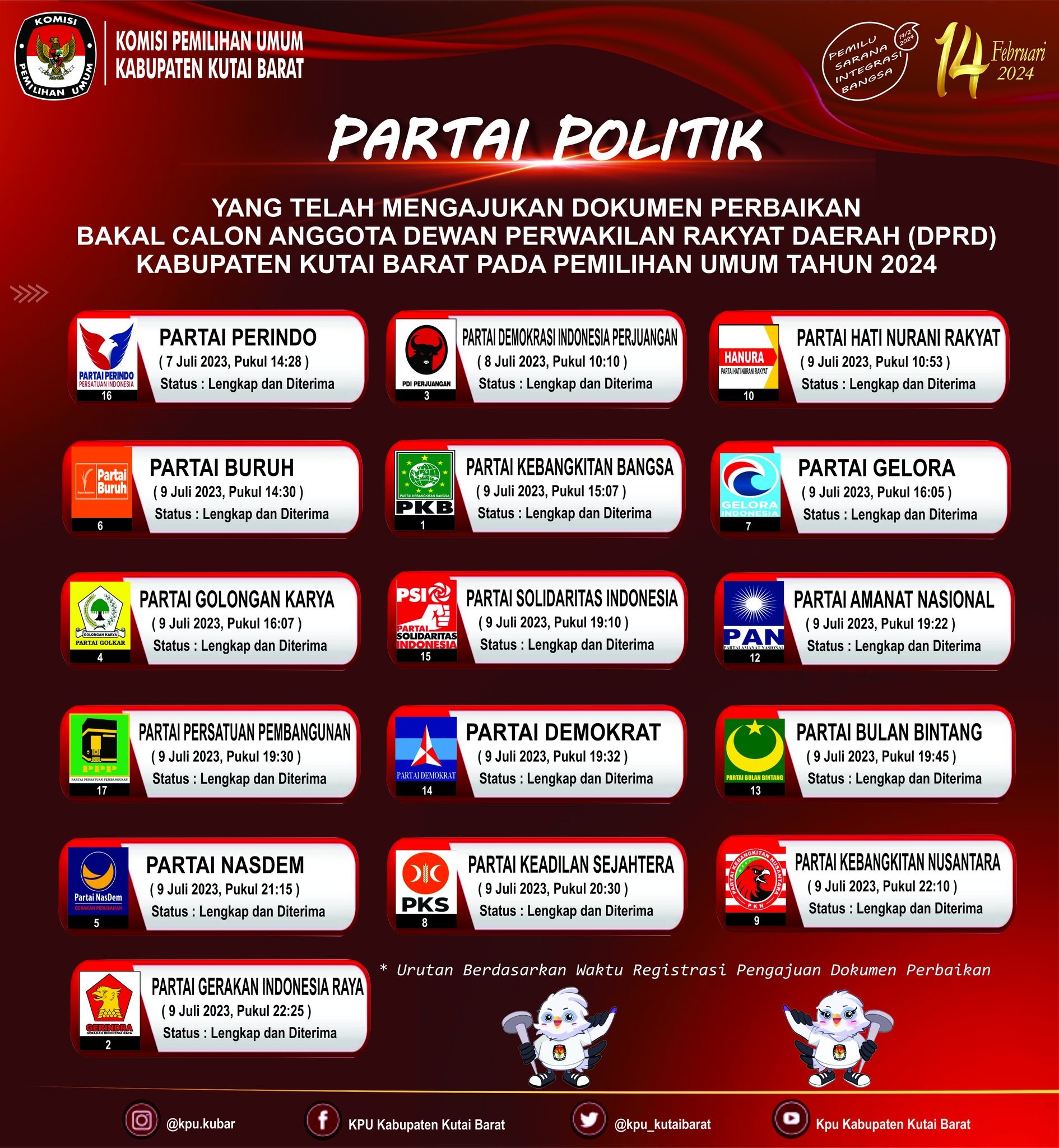 Berikut adalah Partai Politik Yang Telah Mengajukan Dokumen Perbaikan Persyaratan Bakal Calon Anggota DPRD Kabupaten Kutai Barat pada Pemilihan Umum Tahun 2024
