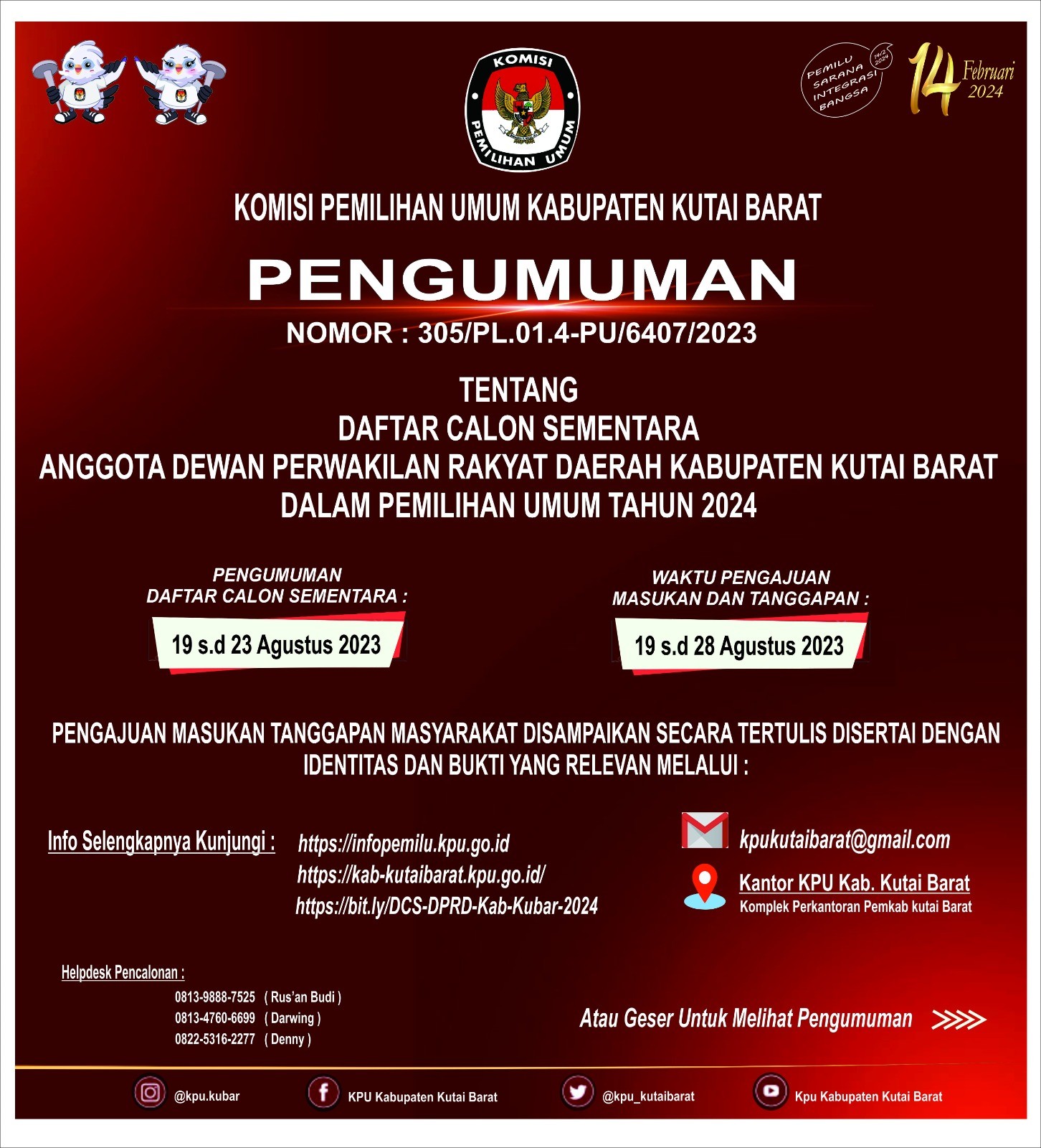 lnformasi lebih lanjut dapat menghubungi helpdesk pencalonan KPU Kabupaten Kutai Barat.