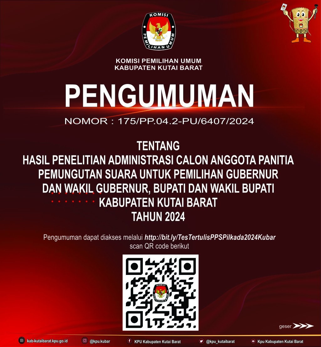 Pengumuman dapat diakses melalui link https://bit.ly/TesTertulisPPSPilkada2024Kubar atau Scan Barcode pada Postingan berikut