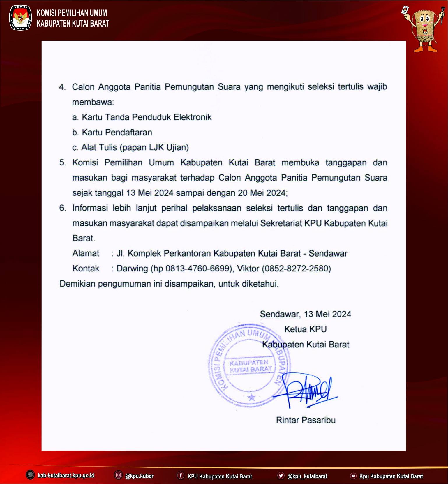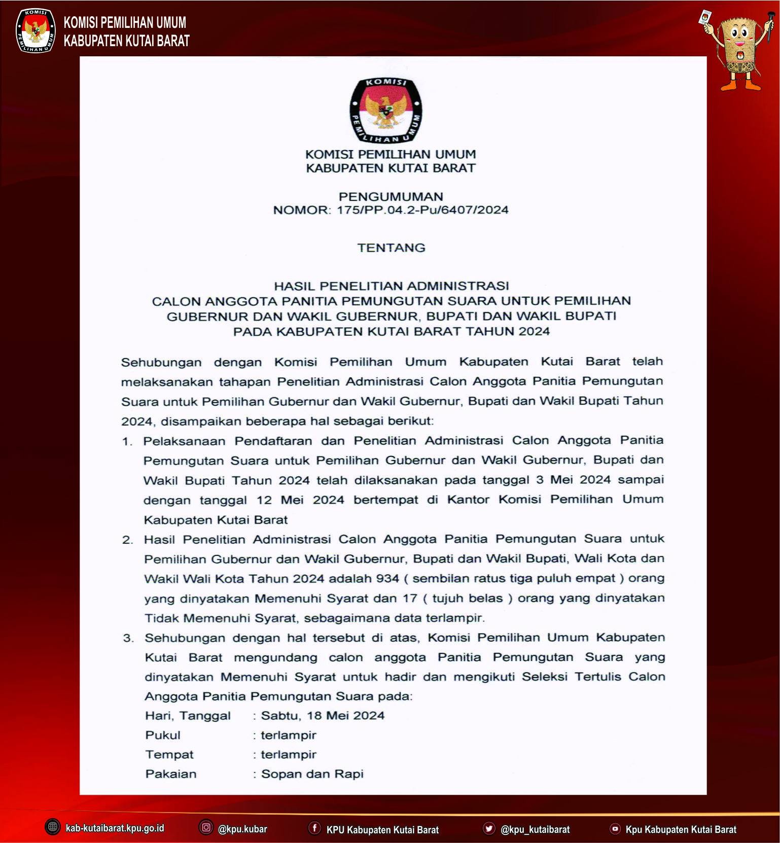 #TemanPemilih Berikut Pengumuman Hasil Penelitian Administrasi calon Anggota Panitia Pemungutan Suara (PPS) untuk Pemilihan Gubernur dan Wakil Gubernur, Bupati dan Wakil Bupati Kabupaten Kutai Barat Tahun 2024