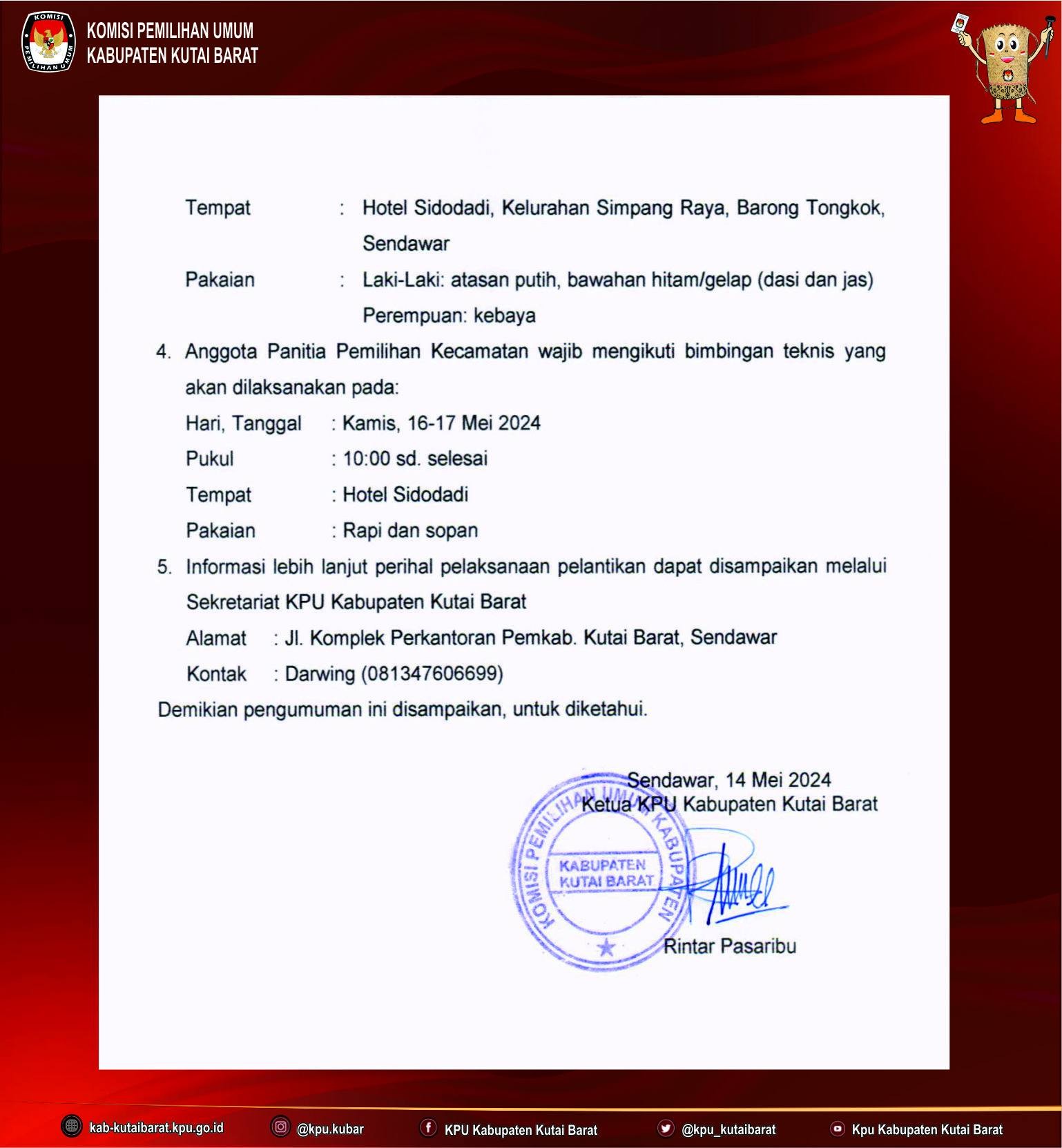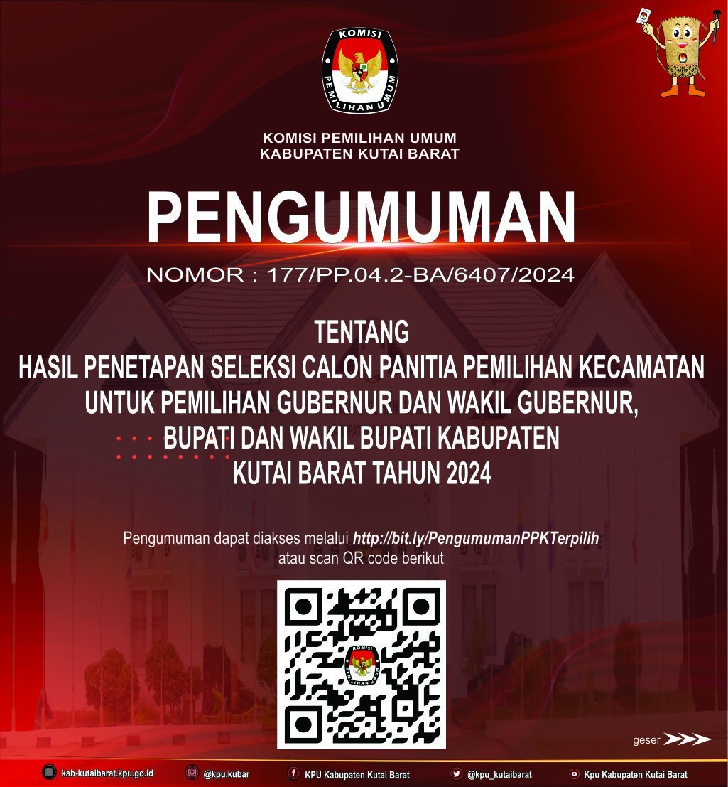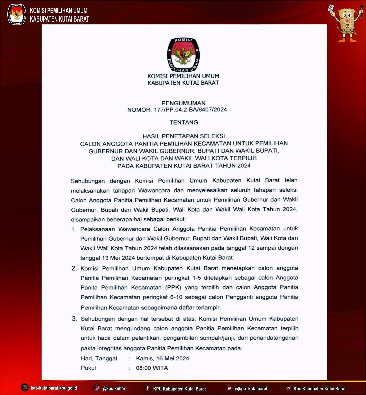 #TemanPemilih Berikut Pengumuman Hasil Penetapan Seleksi Calon Panitia Pemilihan Kecamatan (PPK) untuk Pemilihan Gubernur dan Wakil Gubernur, Bupati dan Wakil Bupati Kabupaten Kutai Barat Tahun 2024