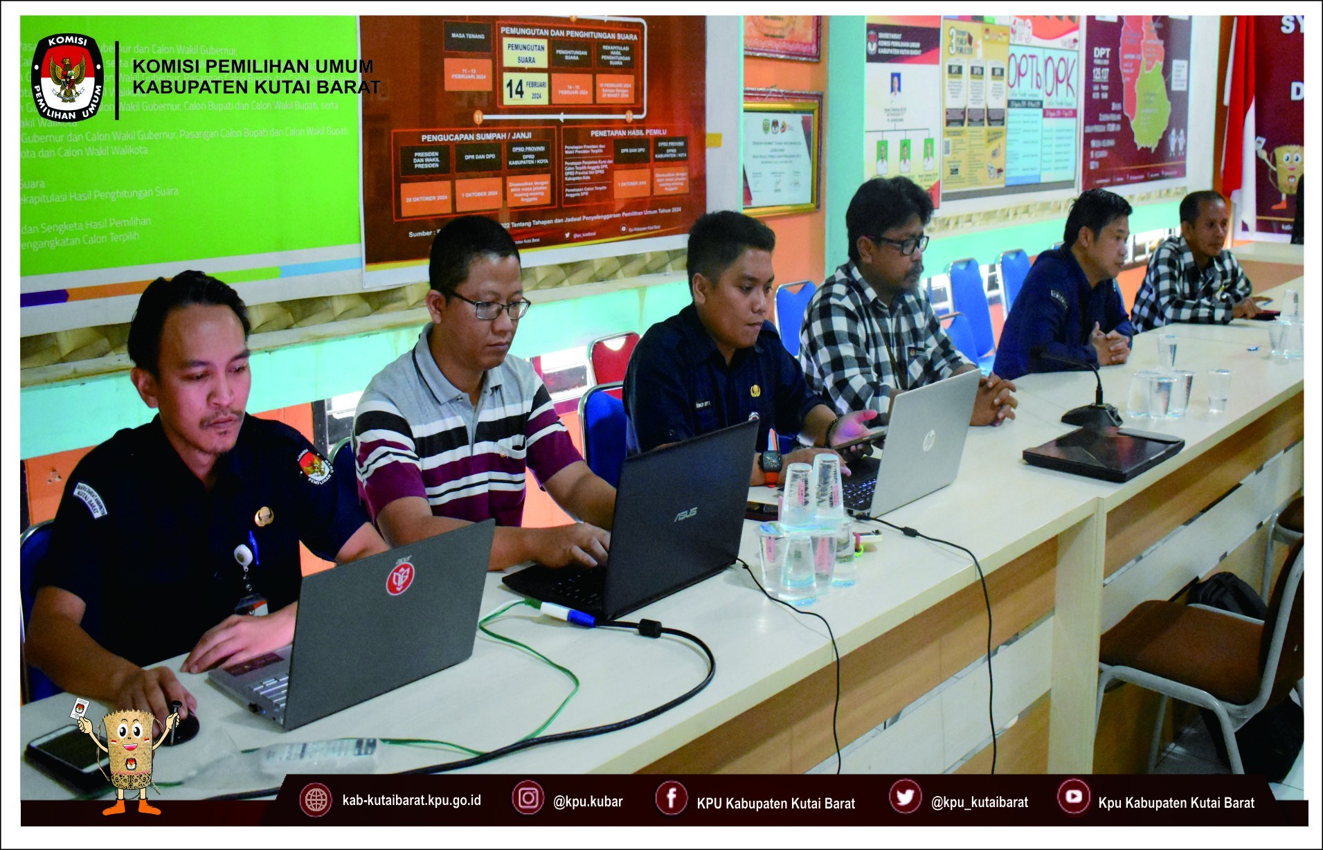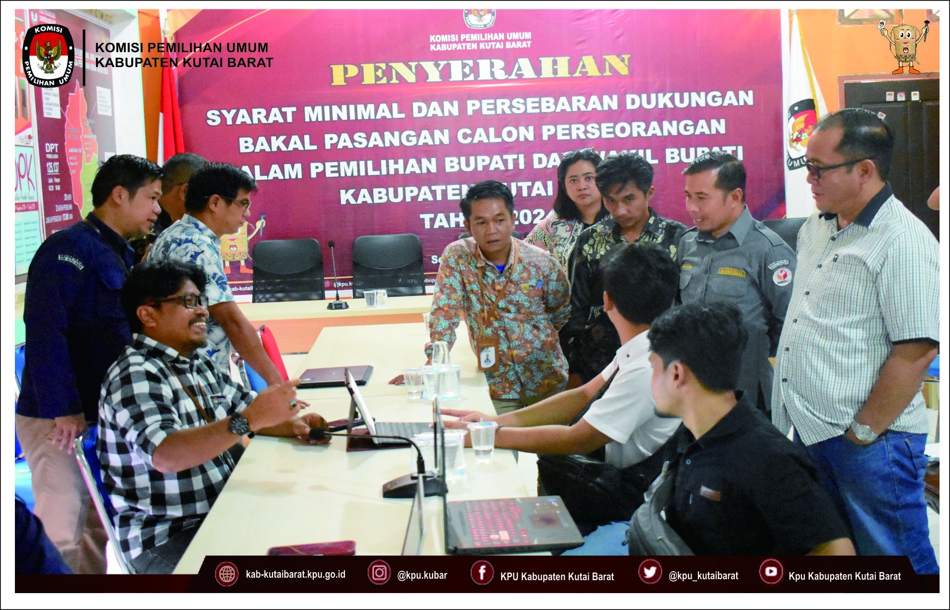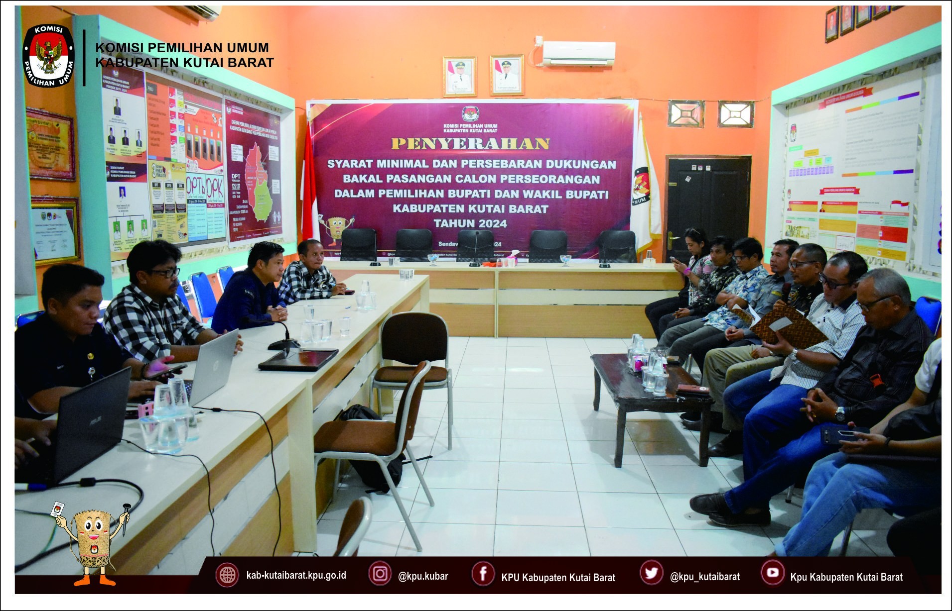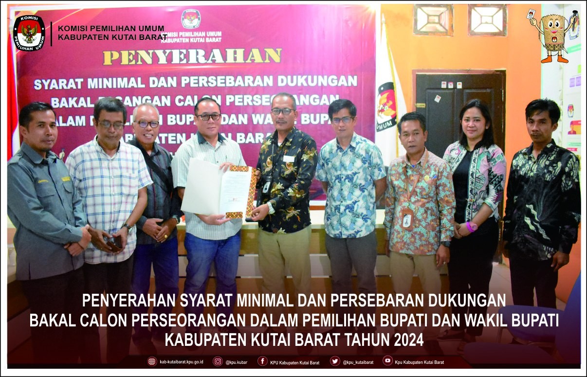 Hai #TemanPemilih Ketua KPU Kabupaten Kutai Barat Rintar Pasaribu didampingi anggota KPU Kabupaten Kutai Barat Dendi Hari Sulistiyo, Elliza Rezandy, Muhtar Kusuma Admaja dan Sulham S, menerima Penyerahan Dokumen Syarat Dukungan Bakal Pasangan Calon Perseorangan dalam Pemilihan Bupati dan Wakil Bupati Kabupaten Kutai Barat Tahun 2024 dari Bakal Pasangan Calon Perseorangan Frederick Edwin dan H. Nanang Adriani, S.PKP, M.Si pada Hari Sabtu (11/05/2024) pukul 09.10 Wita